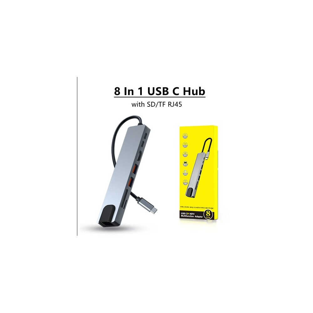 HUB TIPO C 8 PUERTOS A 1 X USB*2+ RJ45 +TF/SD+HDTV+PD
